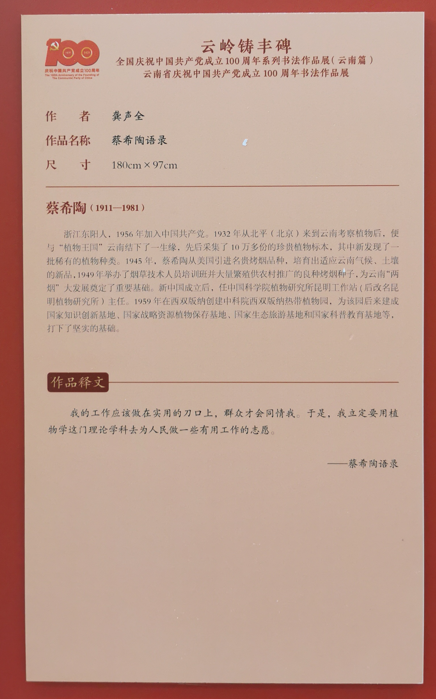 由中国书法家协会、中共云南省委宣传部、云南省文学艺术界联合会主办,云南省书法家协会承办的“云岭铸丰碑”云南省庆祝中国共产党成立100周年书法作品展,得到了全省广大书法家、书法工作者的积极响应。我校龚声全老师书法作品《蔡希陶语录》从全省近1500件来稿作品中脱颖而出,入选本次云南省庆祝中国共产党成立100周年书法作品展。