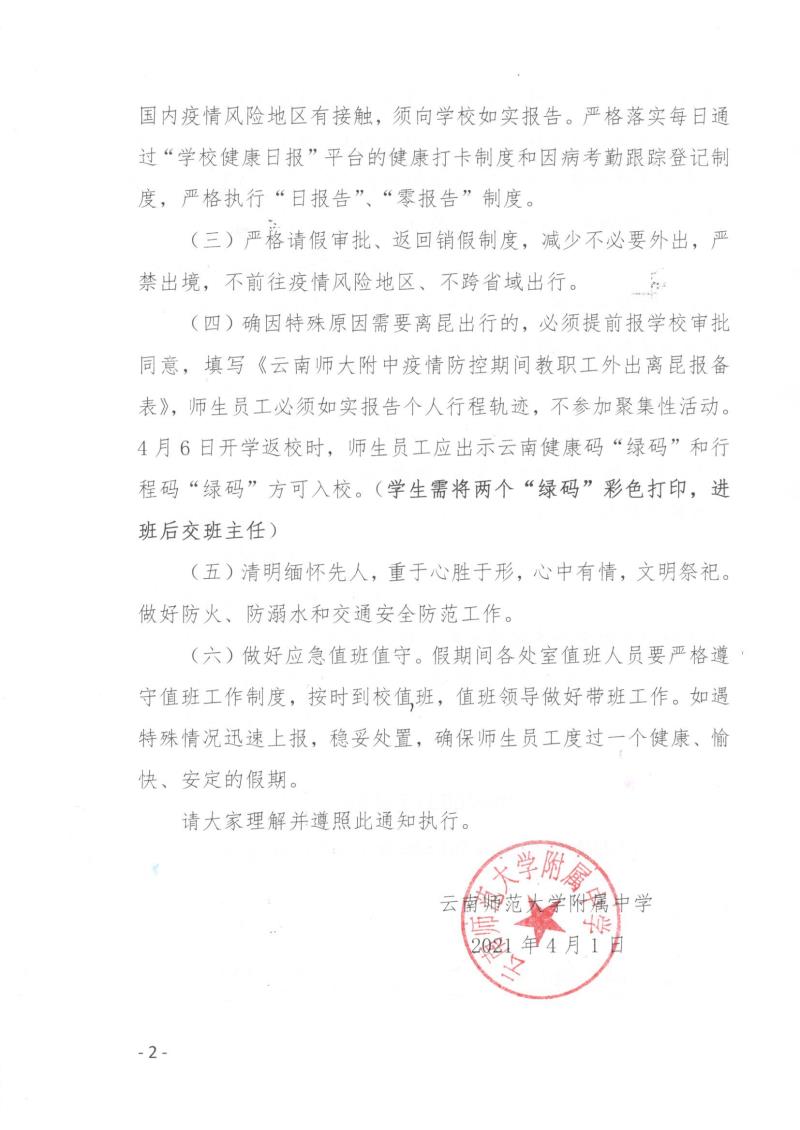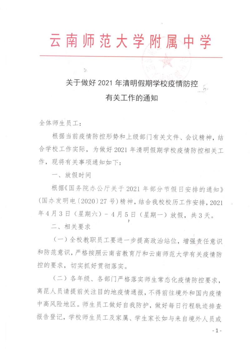 全体师生员工:根据当前疫情防控形势和上级部门有关文件、会议精神,结合学校工作实际,为做好2021年清明假期学校疫情防控相关工作,现将有关事项通知如下: