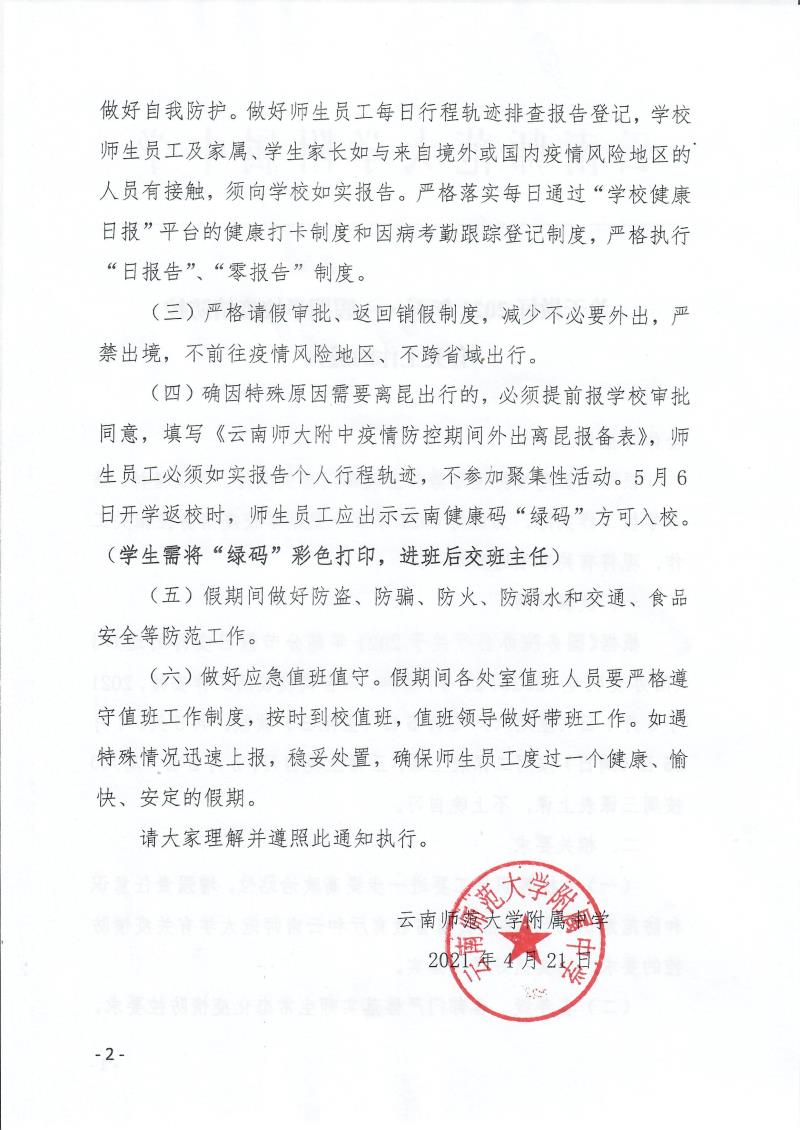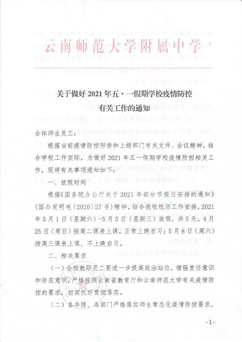 全体师生员工:根据当前疫情防控形势和上级部门有关文件、会议精神,结合学校工作实际,为做好2021年五一假期学校疫情防控相关工作,现将有关事项通知如下:
