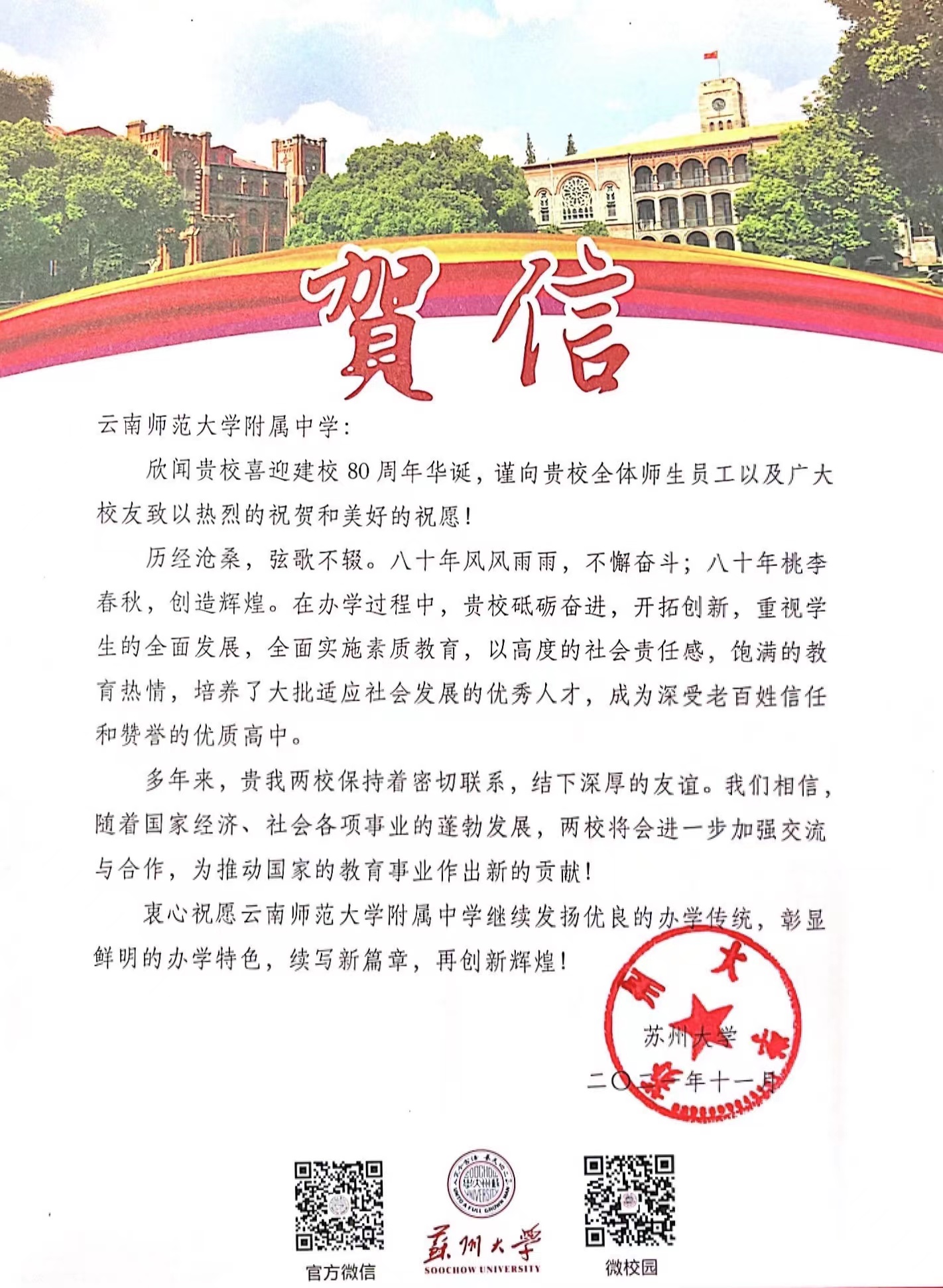 苏州大学贺信